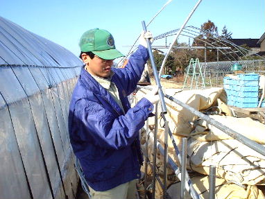 2001年2月20日(火)![]() 先月の大雪でビニールハウスが倒壊(1月21日の日記に画像あり)してしまい、その修理の方法を色々検討してみた結果、最初は、全部解体して、新たに立て直すつもりでしたが、うちのハウスは、パイプの根元に基礎としてコンクリートで固定してあり、柱の方は、曲がっていないので、根元から50cmの所で切断し、その柱の径よりワンサイズ大きめのパイプをジョイント(画像)としてつなぎ合わせることにした、これが、けっこううまくいき、見た目はまったく分からないほどである、良かった、良かった!これを全部解体して立て直すことになると経費、労力、時間がかかってしまうところであった ハウス修理作業、餅袋詰め |