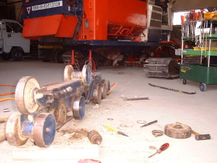 2001年7月19日(木) コンバイン整備にはいる、整備と言うよりも、各部の点検して、消耗部品の注文をするのである、ほとんどの部品は、早く納品されるのだが、たまーに、なかなか納品されない部品もあるので、早めに注文する、とくに、今年は、コンバインの足回り、クローラー、ベアリングを交換するので、よけいです、 でもR1-55コンバインの足回り、けっこう大変、ゾーッとします、あーぁ、農機センターに出そうかな! |