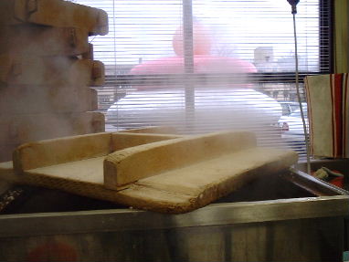 2001年12月5日(水) 今日は、一日中、まる餅加工作業、まる餅機にお餅を入れてノズルから、ま〜るいお餅が出てくる、それを手で板の上にならべる、まる餅10個入りの価格は550円、と言うことは、50円玉を板の上にならべているようなもの、ほんと毎日、工業生産的に餅加工作業をしてると、食べ物より、なんだか別の物に見えてくる、だから、時々、つまみ食いをする、さすが林さんちのお餅、うまいっす!な〜んて自我自讃、 |