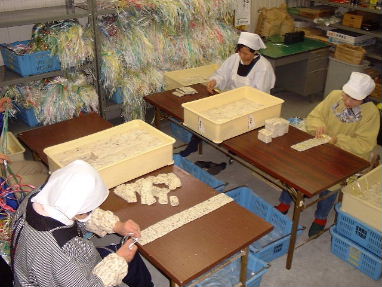 2002年1月16日(火) いよいよ今日からカキモチ編み作業に入る、 一日目、カキモチ用のお餅の加工、二日目、カキモチ型出し、三日目、カキモチ切り作業、そして、ここでばんじゅうに入れて、四日間ほど放置しておく、カキモチを切ってすぐに編むと、お餅には、まだ水分が残っており、また、お餅自体に応力が残っているので、干した時に、急激に乾燥するため、曲がったり割れたりしてしまう、 ただ、今日みたいな暖かい日は、カキモチ作りには適してしない、とにかく天候により、かなり左右される、じっくり雪が積もって、気温が低く、一日中、気温の変化が少ない天候が好ましいのだが!今年は、どんなもんか? どうしても干す場所が限られているので(プレハブ)気温の変化が大きい、本当は、どこかの蔵みたいな所がいいのだが、そんなに広い蔵なんかあまりないもんね、プレハブのライスセンターしかありません、うちは、その干す場所に合わせてカキモチの加工を工夫しました、この技術を確立するまで、昔は、よー割れたりカビたりしましたわ!! ![]() ![]() |