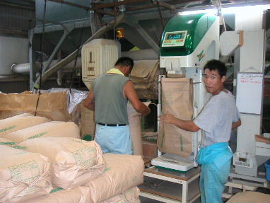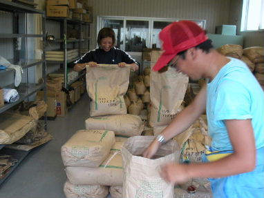 2005年8月5日(金) 乾燥調整作業、 これはコンバインで稲刈りした籾を乾燥機に入れ、籾摺り機で選別して、計量機で袋詰めをします、 ここはオレの腕の見せ所(これのために会社にいるようなもの)、カンと経験で慎重に作業を進めます、せっかく苦労して育て上げたお米、失敗は許せませんから! |