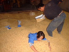 2001年10月31日 珍しく一日中、トラクターに乗っていた。画像は、藤陰幼稚園でカレーを食べているシーン。結構、大盛りでお腹一杯になった。もう一つは、林さんちのトップページ画像の撮影風景。本当は、大豆の中を泳ぐと言うイメージだが、なかなか難しいなぁ。売上げを、左右する大事な画像だから、なんとかアイデアを絞ろう。でも、あんちは、大豆に埋まると言う夢?がかない大満足のようだった。