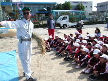 2001年10月26日 午前中、藤陰幼稚園の脱穀に出かけた。上2枚は、徳野幼稚園の画像。園長先生自らのデジカメ画像を転送してもらった、さすが! 林先生の話を真面目に聞く子供達「これが、あしぶみだっこっこくき。ハイ!言ってみて!」と、5台!の脱穀機での作業風景。 下2枚は、藤陰幼稚園のある西別院の境内での、セット風景。う〜ん、浄土真宗って感じだなぁ。それと、軽トラックにトウミと脱穀3台、その他を満載した画像。これで、金沢駅前を走るのは、結構勇気が必要です。 林さんちのフレンドリーサイトほんだ農場HPが、ニフティが主催するホームページグランプリにエントリーした。投票ボタンが、ほんだ農場にあるので、ぜひ投票下さい。上位入選バトルで、負けた方が、おごるってのはどう?