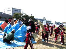 2001年10月16日 大豆収穫と、暮れ起しと、もちつきの、3チームに分かれて作業をした。これから、このパターンが続く。午後は、富陽小学校の脱穀をした。土曜日が雨で順延になり、平日に行ったが、ボランティアの方も少なく、特にお父さんが居なかったので、子供達は、好き放題遊ぶ子が出てしまった。やはり、お父さんの存在が大切だと痛感した。その分、お母さんが、足踏み脱穀を2時間も踏むことになり大変だったと思う。ご苦労様でした。明日は、きっと筋肉痛ですよ。 |