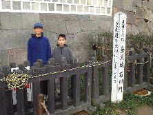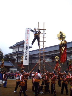 2002年1月1日 明けましておめでとうございます。元旦だが、新しい金沢城公園で、加賀鳶をすると聞き、例年になく早起きして、見に行った。すると、NHKの全国放送用に、10時、10時23分、45分と3回もやっていてビックリ。でも、細切れの演技で、しかも、風も強く冷たい中、ディレクターさんの命令でやるので、演技者はつらそうだった。今度も、気合十分完全フルバージョン版を見れず残念だった。でも加賀鳶保存会の組織力は、大したもので歴史が違う感じがした。うちも、1月6日午前11時、負けずに気合の演技を見せようと、心に誓った。 帰りに尾山神社で初詣。おみくじは、末吉。謙虚にしなさいとあった。今年の目標は、私にとって一番難しい「謙虚」になった。画像は、復活した菱櫓(ひしやぐら)をバックに、加賀鳶演技最後の敬礼+垂れ幕の演技。石川門の子供達「寒いから、早く帰ろ〜よ」