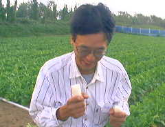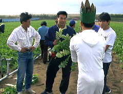 1997年9月29日 「だいこんかじって交流会」 土曜日の話だが、農業青年会議の関係で、交流会に行ってきた。金沢地区のメンバーと 知り合えるいい機会だ。50人は集まっただろう。半分近くが女性でおどろいたが、 農業青年ではなく、その知り合いのようだ。テレビ金沢も来て、なんと今回は自分に マイクをしこまれた。「スパイ大作戦」の気分だ。はたして任務を遂行できるのか!? 5班に分かれて、最初は農業青年本人の畑をまわる収穫体験で、うちの班はトマトと 大根畑だ。どちらの収穫も、生まれて初めてだと思う。トマトの失敗はテレビに出る かもしれない。下手だから「へた」が取れた。だいこん足は簡単に引っこ抜けた。 女の子がバナナを食べてる、と思ったらなんとだいこんをかじっていた。自分も やってみると、意外と食べやすい。「尻尾はにがい」といわれて、折って食べると不思議と おいしい。水分補給にはいいかもしれない。しかし、畑でだいこんをにぎりしめ、二つに 折ってかじる、なんていうシーンは、テレビカメラに気づくと大笑いしてしまった。 そのあとはみんなでバーベキュー。楽しいゲームもあり、すばらしい仮装をした 大根マンとも記念撮影できたし、いい息抜きになった。そういえば、胸のマイクの存在を 忘れてた。指令なんて、あったんだっけ?自分もデジカメを持っていって、決定的瞬間を 撮影するつもりだったが、すっかり参加者として楽しんでしまった。フラッシュがないから、 写りもよくない。任務は失敗だ。「例によって君もしくは君のメンバーがとらえられ、 あるいは・・・」の声が聞こえてくる。当局は一切関知してくれるそうだ。続編の ミッションインポッシブル2をお楽しみに。