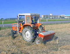 1997年10月9日(木) 快晴 「田んぼでスピンターン」 田んぼにケイカルを撒いた。ケイカルのことは自分もよくわからないが、目的は土作りだ。 稲作の一年は、稲刈りが終わった直後がもう始まりなのだ。田起こしは暮れと春の2回行うし、 種まきなど、春は仕事が多く、田植えなんてもう中盤かもしれない。 左の写真はケイカルを補給しているところ。1袋20キロで、田んぼ1枚に7〜8袋ぐらい撒く。 ただ撒くだけだからトラクターにほとんど負荷はかからず、田んぼ1枚を終えるのに10分 かかっているだろうか?社長の運転はもっと早く、田んぼのローリング族という感じだ。 180度ターンを何度も繰り返すのだが、横転してしまう危険もあるぐらいのスピードでないと、 冬までに間に合わないかもしれないのだ。右手は、トラクターの後部を上下させるレバーを 常に握っているので、ターンのときは左手一本でハンドルをぐるぐるぐるぐるぐるぐる回す。 ケイカルの袋も1.5トンぐらい運んだ計算になるし、こりゃあしたは筋肉痛だ。