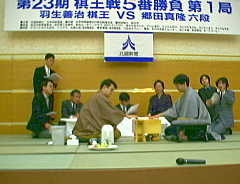 1998年2月14日(土) 雨 「羽生4冠王登場」 今日は外注のかきもち等を作った。わざわざ手伝える格好で見学にまで来ていた。 予想に反して若い女性で驚いたのだが、自分には今日はさっさと仕事を終わらせたいほど 気になっていることがある。将棋の棋王戦第1局が、なんとグランドホテル松任であるのだ。 去年六星のパーティや県大会で行った場所だ。しかも午後からは公開対局で、羽生善治棋王に 郷田真隆六段が挑戦する。「中村は羽生君に似てるから、トイレでサインを求められるんじゃないか」 と言われ、紋付きはかまで行きたい気分になる。夕方駆けつけると、終盤のいい場面に間に合った。 写真は終局後の様子。明日に続く。
