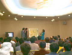 1998年2月15日(日) 晴れ 「将棋界の魅力」 写真は昨日の棋王戦の、大盤解説会場。中井女流五段が飛び入りで参加し、会場は華やかに。 実は自分は羽生棋王が目当てというより、矢内理絵子女流王位が一目見たかったのだ。 数年前は高校生挑戦者として話題になり、駒音コンサートではピアノも上手なお嬢さんだ。 すれ違うチャンスがあったのだが、とても声はかけれなかった。結構自分てミーハーかも。 しかし棋界はよい。ファンにとっては、芸能界より本人に近づくことが可能。羽生君にでさえ、 対局者でなく解説者だったら握手を求めることもできそう。そして、もみくちゃにされるような 騒ぎもない。なにより対局中はみな静寂に気を使う。対局会場は水を打ったような静けさで、 大勢の人が見てる中で聞こえるのはピシャっと響く駒音だけ。皆テレビ画面の指し手に注目して、 あれこれ考えている。この雰囲気がたまらなくいいのだ。郷田挑戦者の粘りもなかなか魅せてくれた。 別室では福崎八段の爆笑脱線解説に会場全体が大笑い。楽しかった。