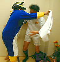 1999年4月26日(月)曇り 「田植えは29日より」 代かきだが、林農産で3日連続カッパを着て仕事したのは珍しいかな。仮装パーティ等の時の写真をバカーズのデジカメからたくさん仕入れたけど、のっけるのを忘れてた。林農産Tシャツものせたいが、限定2枚でまだ追加生産はしてない。田植えの時にバカーズ功労者に持ってきてもらおう。勲章授与式は、私の趣味でスターウォーズ・エンドタイトルのかっこいいテーマにのって行った。レイア姫はいないけど、感激したチューバッカに襲われる瞬間をフォーカス。 ![]() |