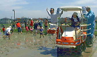 1999年5月26日(水)晴れ 「ウハウハ田植え」 今日は小学校と幼稚園の手植えイベントを同時進行で行った。早速夕方のMROのテレポート6で報道されてたけど見た人いるかな。写真は保母さんが田植え機を運転し、社長は嬉しくて加賀鳶?をしている。午後にはハウスの解体もし、ホットな日だった。 ![]() |