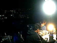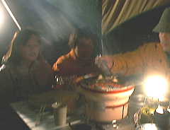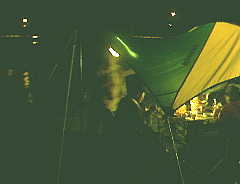 2000年10月28日(土)曇りのち雨 「野営訓練」 白山麓ふれあい市出店、がんこ揚げを120g200円で、70袋売りさばく。夜は8時から1時間もちつきの仕事。それからまた雨空喫茶へ遊びに白山麓へ舞い戻る。ふれあい市は6町村で開催だが、春に出店した鶴来町・道の駅から手取川へ降りていった所で鍋料理。自分はドリップ式でコーヒーをいれる。七輪で前回の願望だったシシャモを焼く。うまい。いずれ雪上でもやることになるだろう。条件が不利になるほど、「やった」という実績を作るだけで楽しくなってくるはずだ。炭火は暖かい。右の写真は、橋と川とタープ(テント)を一緒にいれようとしたのだが。画像処理を駆使したら暗視スコープ使ったみたいだね。このデジカメじゃこれが限界、分かるかな?