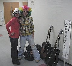 2001年1月28日(日)雨 「鮮烈デビュー!」 県大会での興行は、無事、大成功を収めた。活動紹介は、やたらと硬い発表をする地区が多い中で、うちらの発表は異質。「今どきバンドも持ってない農業青年クラブは、はやらない!」「サッカーリーグもない農業青年クラブは、はやらない!」と言い切り、奏者、選手が出演したあとで「表現が傲慢であったことをお詫びいたします」とフォロー。写真は我が地区の誇る?ストリートミュージシャン「チビッツ」。「一瞬でいいからバンド出演しない?」とお願いしたら、衣装を自前で用意した。さすが関西芸人、ほれぼれする舞台度胸のよさ。チンドン屋か音曲漫才風をイメージしてたから、「ドサ回り?」と聞かれて私は満足。身内の大会だし、自分達自身が一番楽しまんとね。それは自信ある。 ちなみに私はサッカーユニフォームでボールリフティング、わずか2回で失敗。(実はこれが一番ウケた!)天然だが、予定通り。今回のパワーポイントでの発表は、ストーリー性があって今までで一番いい出来だったけど、狙った所では意外とウケないもんだね。 その他、ビンゴゲームの賞品のくじ引きでは、まどか君が3連続”青汁”を引いたり、技術競技(農業の各分野から80題出題、入試みたいだった)では上位3名を我が地区で独占、石川松任ここにあり!と散々見せつけてきた。素晴らしい(両極端?)仲間を誇りに思う。 ![]() まさに本番直前、舞台の袖?にて・・・ |