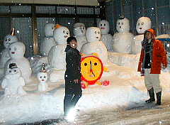 2001年1月30日(火)雨 時間もないので、写真。土曜夜の、白峰村雪だるまウイーク、9時すぎてから出発したので、すいててよかった。以前三宅君と行った時はメインの日から外れてたはずだが、今回はローソクに火が灯ってる雪だるまもたくさん見られた。次回はやっぱり混雑してても屋台も出てる時間がいいね。山岳救助隊は「今度はカップルで!」と誓い合う。そりゃやっぱり、肩抱いてるペアが目に付くお祭りだな。 ![]() |