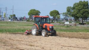 秋晴れで津幡とくの&とくの幼稚園の稲刈りが楽しく出来た・カルス菌散布予定の籾殻田を予め鋤き込む・2023