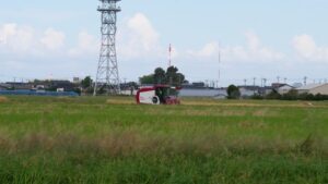 藤蔭幼稚園の稲刈りが珍しく?好天で終了・けい酸散布コシヒカリに突入