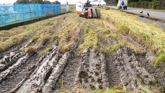 ようやく後半コシヒカリの稲刈り開始です。今年の栽培方法の大きな変更の一つのコシヒカリを前後半に分けて作付けして後半の刈り遅れを防ぐ作戦です。これで胴割れしていたら元も子もないので品質良好を願っての稲刈り開始です。でも今日は、軟弱でしかも倒伏による泥稲と恐怖のイボクサの攻撃を受けてまったくペース上がらず。しかも先週のミルキークイーンの籾摺りのために1台体制での稲刈り。でも明日は、晴れるとタカをくくっていたらなんと雨マーク点灯。しかも明日は、富陽小稲刈りもあったのでダブルで稲刈り中止になりそう。どうにもこにうにもいい加減に秋晴れが続かないものかとボヤいてしまう。これでは、稲刈りが終わりません、、(×_×)