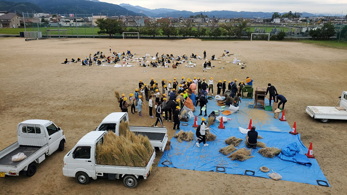 今日は、心配していたお天気もなんとか晴れて富陽小の脱穀が無事に出来た。でも開始早々に大ピンチがありました。なんと保護者に脱穀のお手伝いの通知が連絡ミスで出てなかったのです、、(◎_◎) しかも予定していたボランティア団体がドタキャン。結局、私がお願いしてあったJAののいちと虫送り保存会のメンバーのみ。でもこの人員では、足踏み脱穀をするには、まったく足りない。そこで窮余の策で富陽小5年生男子に足踏み脱穀をしてもらうことに。でもこれが良かった!子供達も楽しめたと同時にメッチャ戦力になりました。しかも足踏み脱穀で人員が減ったので稲を運ぶ子供達も大忙し。とても充実した時間になりました。まさしく禍を転じて福と為すの脱穀でした。来年からは、この方式でやります、、o(^o^)o 後は、子供達の収穫も全部終わったのでけい酸散布&秋起こしに集中です。そして第4Qには、北菱電興さんとアクアポートの今年のデータの検証をしました。総じて今年は、豊作だったので収量増の率は、昨年の10~20%でなく2~10%でしたがそれでも確実に収量増に繋がっていました、、(o^-‘)b