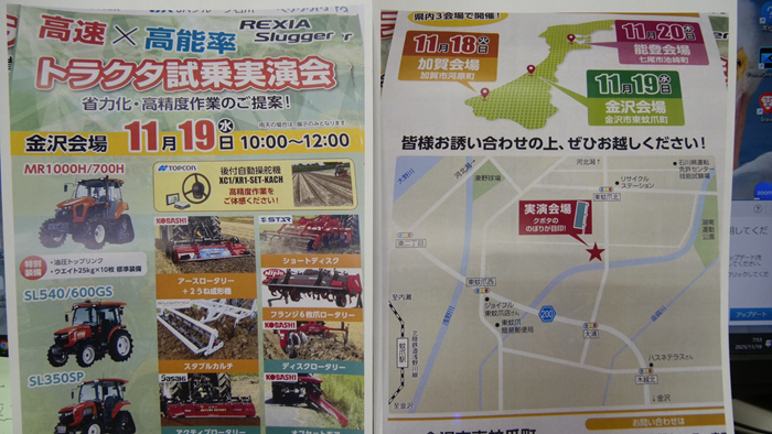 今日もお正月用のお雑煮用丸餅製造だが昨日からいろいろとトラブル発生。どの道具も機械も10年以上使っているので消耗しているが全開で搗き始めてから一気に出て来た。そんな中、私は、朝からクボタ実演会に出かけたが地図にある場所に会場が無い。会場が河北潟だったので昨晩の雨で田んぼでの実演会が出来なかったようです。少し迷ったがなんとか旗を見つけて撮影開始。田んぼじゃなかったけど逆にコンパクトにライスセンターの駐車場での実演会だったので撮影的には、上手く出来て良かった。そして私の目的は、オフセットモアの取材。最近の夏の草刈りが大きな負担になっている。そろそろ導入を考えています、、d( ̄^ ̄)