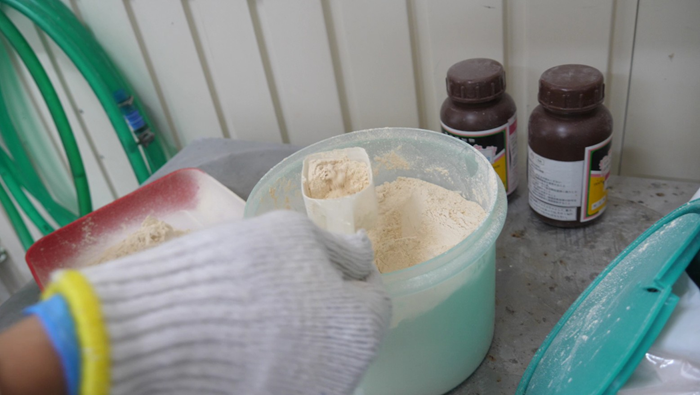 休日出勤で5合鏡餅を全開製造・カビ抑制の粉ワサビ+お塩+紅色着色料の投入で結構大変です