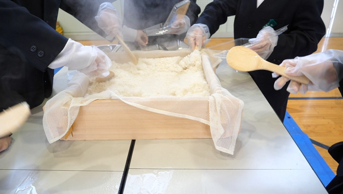 富陽小5年生に米作り体験学習の集大成「志の会&おこわを味わう会」・カキモチ編みを開始