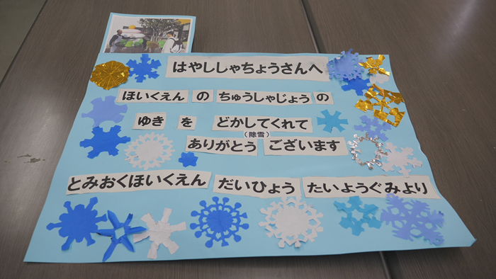 あの大雪の影響がまだ続いていて深夜から除雪の音が鳴り響いていました。林さんちもまだまだ除雪作業が続いています。そんな中、カキモチ搗きが終了してひし餅製造に入りました。私は、今日は、野々市市の食育事業の会議の後に衆議院選挙の期日前投票に行きその足で眼科医院で白内障手術の3週間後診察に行きました。検査の結果は、異常なしでした。そして今日、いつも駐車場の除雪をしている「とみおく保育園」と「ふじひら保育園」の子供達から可愛い感謝状が届きました。どうも明日から大雪の第2波の予報なので除雪にこれで力が入ります、、o(^o^)o