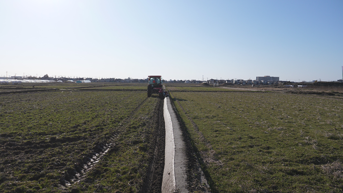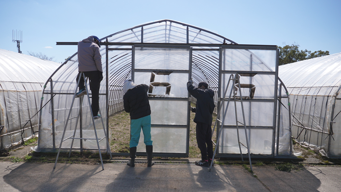 今日は、昨日の雨から一転して朝からハウス張り日和。さっそく残り3棟を張る。でも30数年前に14棟で始めた育苗ハウスも今では、昨年から当時の作付け面積の2倍になっているのにまた1棟減って半分の7棟になった。GPS田植え機により高精度田植えや密潘苗導入で使用苗箱数が当時に半分に加え種まきを4~5回に分けてハウスを2回転させていることで使用棟数が激減した。さらに数年前は、ハウスポリを全部外して畳んで春にまた全部張ることを繰り返していたが今では、巻き上げ式を下すだけ。この時間と労力削減は、以前の半分以上。以前は、バイトさんもたくさん呼んで朝から夕方までかかって丸々二日間。下手すればそれ以上だった。それが今では、最小人数で1日は、かからない。この巻き上げ式は、Youtubeファンから教えてもらったが本当に良かったと感じています。ハウス張り午前中かからずに終えて速攻でハウスドア取り付け。午後は、田んぼ仕事にみんなで出動しました、、\(^o^)/