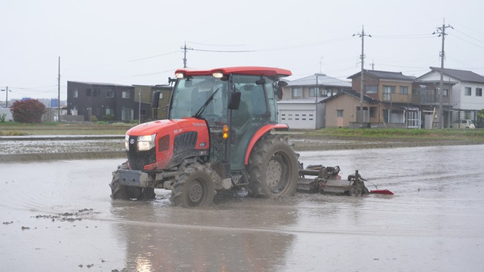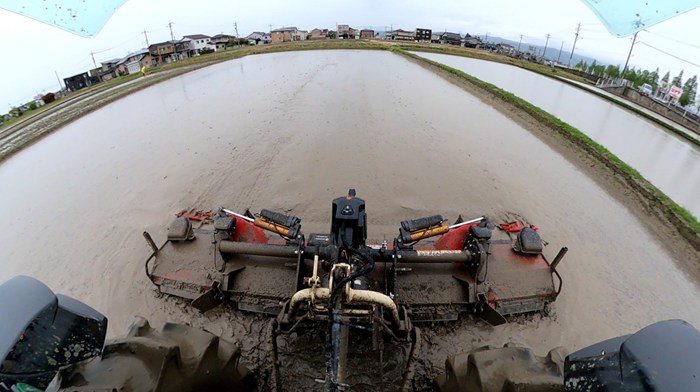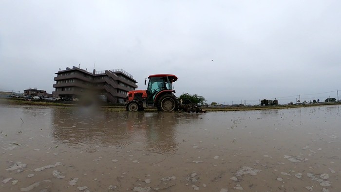 4回目種まきのカグラモチ種籾をシャブシャブ・雨ニモマケズ代掻き2台体制で全開です・2026
