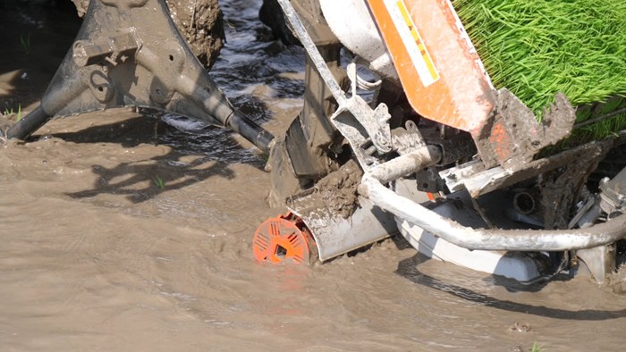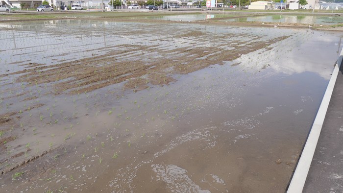 今日の田植えは雨で水が多いし籾殻田と大豆跡もあってややこしかった・籾殻に田植えしたけど育ちますよ~に!・2026