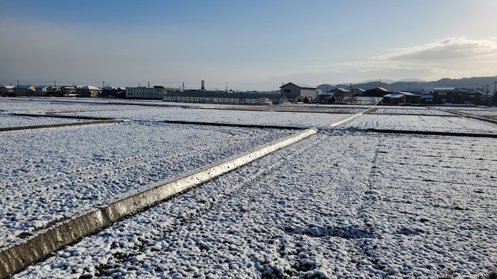 朝起きたら一面銀世界。あまり積もるとせっかく塗った畦が崩れるのでちょっと心配。でも朝日にピッカピカ輝く畦は、美しい、、(⌒‐⌒)