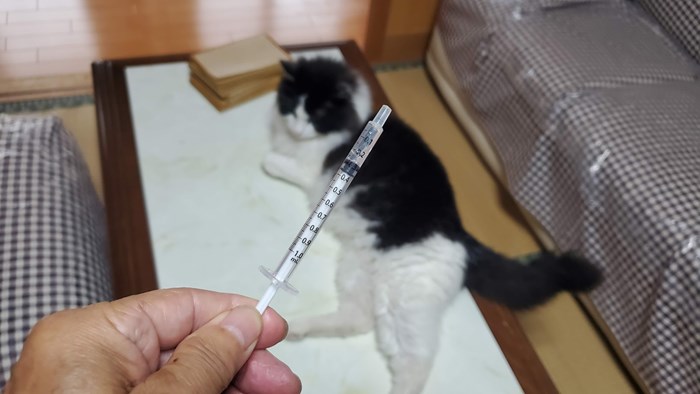 最近食欲不振のチョミゾウ、、毎朝のお薬です。注射器でピュッと口に入れます。