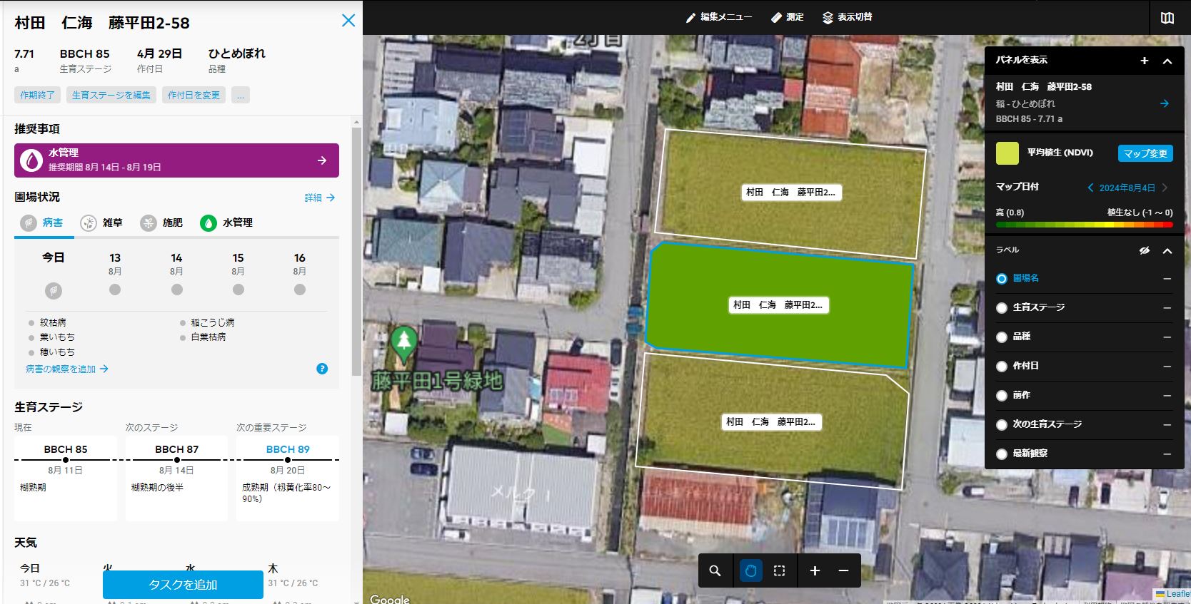今日は、お盆休み。一昨日から昨日まで富山の実家へ帰省していました。息子家族も来て楽しい時間を過ごしました。そして今日は、お盆休みで何も予定がないのでノンビリ過ごしていました。でもハナエチゼンの稲刈り適期の判断をしないといけないのでハナエチゼンの田んぼへ。目視だともう完全に黄化していていつでも稲刈り出来そう。でも全部のハナエチゼンを観て回るのも大変だし結局横から観てもなかなか全部は、観れない。そこで田んぼじゃなくて事務所でザルビオAI生育診断で稲刈り適期を判断。指標は、BBCHの数字で89が成熟期で稲刈り適期。でも稲刈りテスト予定日の8月15日は、87で成熟期直前の数字。そして成熟期の89は、8月18日でしかも日曜日。でも昨年は、稲刈り適期が8月9日でメッチャ早くて稲刈りテストの8月14日と同時に本番稲刈りに突入したら籾摺りでトラブル。選別機のバケットベルトがほつれてゴムがお米に付着するトラブル。でも稲刈り続行中で乾燥機が空かず大ピンチ。だからこそしっかり各工程でテストしたい。そこで多少青くても8月15日にテスト刈りして16日に籾摺りテスト、、17日に新米発売分を刈りたい。あとひとめぼれのBBCH89が8月20日と後も使えています。そこで8月15日にテスト刈りを決断しました。まあ見た目は、いつでも刈れそうなので大丈夫、、o(^o^)o