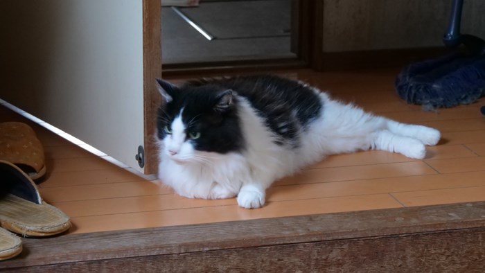 玄関で脱走を企てるチョミゾウ、、目背けてるけどd( ̄^ ̄)