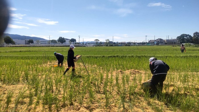 紙マルチ栽培田とれ太郎散布終了・米作り体験学習の脱穀セットを積載