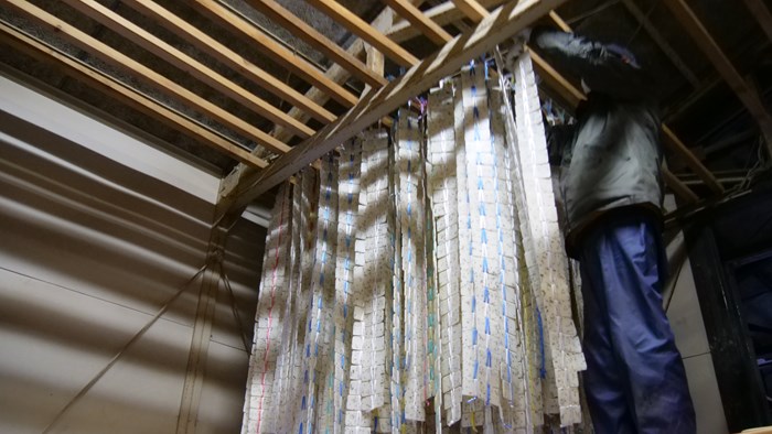 今日は、カキモチ作りの作業工程上どうしても出勤せざるを得ない日で各担当が出勤しました。カキモチ切り、カキモチ編み、カキモチ干しをしました。カキモチを型出ししたら翌日には、切って中二日養生してから編みます。編んだら速やかに干します。切ってすぐに編むと切った時の応力のダメージが残っているので割れたり反ったりします。そこで中二日ほど養生してあげると歪みが元に戻るので上手く干せます。でもあまり長く養生するとカビのリスクが高まります。そして編み終わったらその日のうちに干さないと箱の中で反ってしまうので速やかに干します。でも作業工程上の空白の日も出来るのでそんな日に休日出勤分の代休を取ってもらいます。昔は、1月と言えば農閑期でノンビリしていましたが最近の1月は、逆に農繁期とも言えるので頑張っています。
