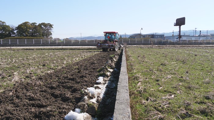 カキモチ下しと同時に残雪ある中あぜクリーン作業再開・お隣りさんも新型ブロキャスで作業再開・2025