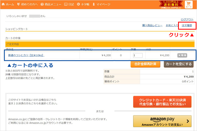 4.カートに入っている事を確認後、上部の注文履歴をクリック