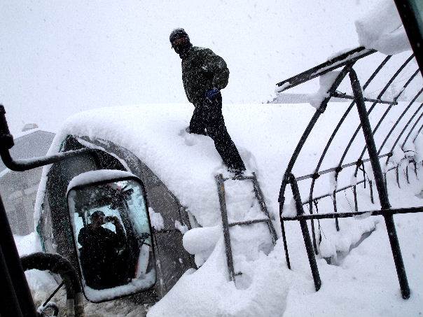 結局、昨日、朝夕と2回トラクターで除雪を行った。それでも今日の朝まで20センチ程度が新雪が積もっていた。しかし小まめに除雪するしかない。こんなに雪が降ったのは何年ぶりだろう。しかもドッカン!ではなくジワジワ毎日降って気づけば大雪である。消防団の格納庫や横の保育園の駐車場もついでに除雪。保育園の駐車場は、火災出動の際の分団員の駐車スペースとして重要なので除雪している。しかし私以外にも、どこの誰か不明だが、いつの間にか除雪をしてくれている。こういうのを地域の力っていうんでしょう。林家は、集落の一番奥にあることもあり、ついでに近所の家の前も除雪。昔は、除雪トラクターが無くて辛かった。大通りに出るまでに1時間かかったこともありました。そして今晩ついに消火栓除雪で、出動が決まりました。やれやれ、、( ̄○ ̄;) そして目下の心配は、ハウスです。現在、倉庫用として2棟ポリフィルムを張ってあるのですが、すでに80センチほど積もった雪が、横にも落ちずに上に積もり始めている。登って見たが頂上部で40センチほどになっている。これをどうやって除雪するかが問題である。ハウスの上で思案していたら、今日の中学校での講話が大雪で中止になった。正直助かった、午後に本気で取り組もう。 ![]() ![]() ![]()