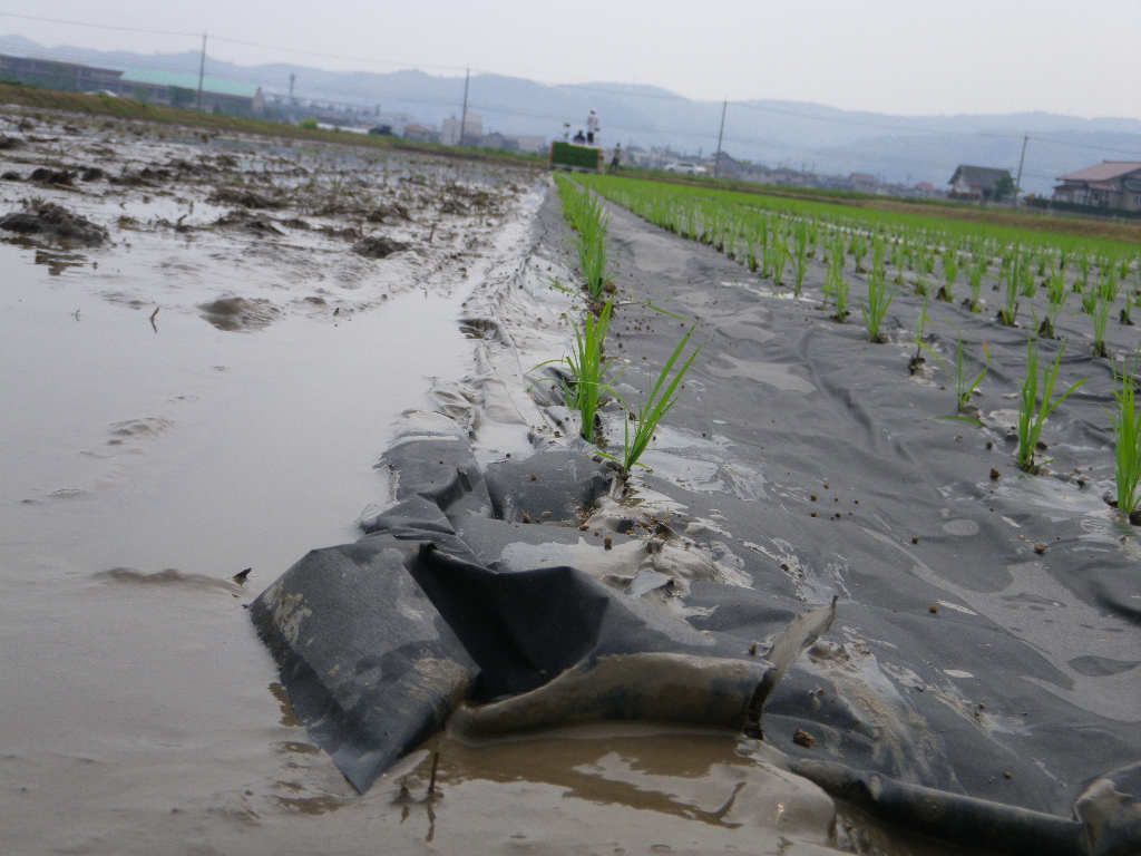 今日は農薬を使わない紙マルチ式コシヒカリの田植えをしました、