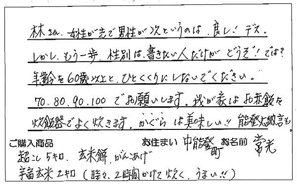 性別と年齢についてのご意見ありがとうございます。林さんちのお客様の多くが女性なので当然です(o^-^o) 赤飯に使う林さんちのカグラモチ白米も自信があります。これからもよろしくお願いします(o^-^o)