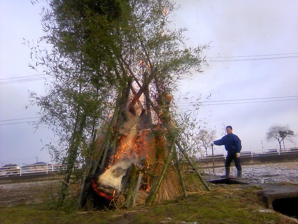 今日は、村の左義長の日です。最近は、土日優先で行事が行われますが、本来は、昔は、15日開催でした。そんな意味からすると、正しい日での左義長です。朝から前日から用意したワラとお正月用品、火を管理するフォーク、消火用のバケツ、そして御餅と焼き網を持参。現地に行くと思ったよりデカイやぐら用の竹が用意されています。おっとこんな大きい竹は、燃え残って始末が大変と焦りましたが、点火後、バンバン竹の爆発音と共にきれいに焼けました。その大きな火で、字が綺麗になりますよ~にと、書初めを燃やして灰を空高く上げます。高ければ高いほど、字が綺麗になると言われています。そしておき火で、お餅を焼いて食べます。左義長で焼いたお餅を食べると、1年無病息災と言われています。私は、自分用と妻と母親の分、3つを焼きました。確かに、昨年1年は、大きな風邪もひかず元気に過ごせました。今年も期待しながら食べました。