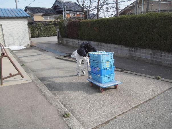今日から3月、好天に恵まれて絶好のカキモチ下ろし日和。雨が降ると、全部、軽のバンに積んで運ばないといけないので時間がかかります。晴れていれば台車でピストン輸送して加工場に並べていけます。加工場で、カキモチの紐を外し、種類別にさらにコンテナに入れてからようやく袋詰め作業です。全部で10万枚あるので、これからの春作業のお天気が悪い日に、地道に行って行きます。今年は、すごく出来が良くて、ほとんど割れたりせず、下ろすときに、カキモチ同士がキン!キン!と軽やかな金属音を奏でています。良く乾いている証拠です。