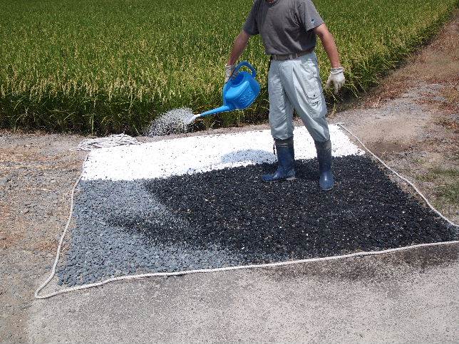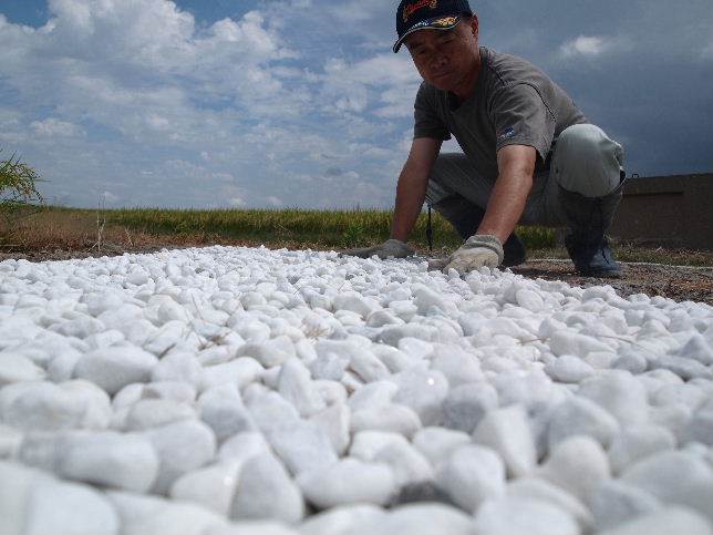 ハナエチゼン新米は、お盆過ぎに収穫です・なぜか玉砂利を敷いてパンフレット撮影のステージ作り