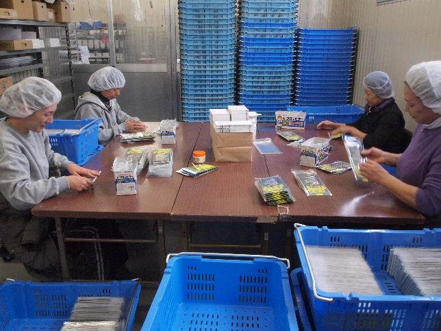 帰社するとパンフレットの袋詰めを女子チームが総出でやっていました。実は、昨晩、バイトさんが1名家庭の事情で離脱、、(ToT) なんでいつも年末に向けていろいろ起きるの?と嘆いても仕方ありません。さっそくバイトの追加手配をかけました。林さんちのパンフレットは、2年分を作製します。今年は、クリヤケースに入れて中身が見えるようにしました。封筒だけだとお餅の注文書が入っていると気づかずに捨てられたからです。男子チームは、祝い餅のセットに使う切り餅の生産に追われています。そろそろお正月餅の生産も始まるので、それらが重なって来て現場は、一気にヒートアップします、、(炎_炎)