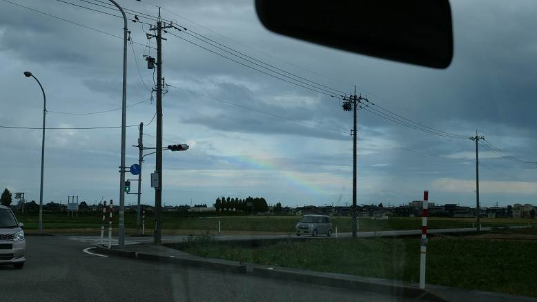 綺麗な虹、、朝、稲刈りに向かう途中。でも右に雨のカーテンが見える。