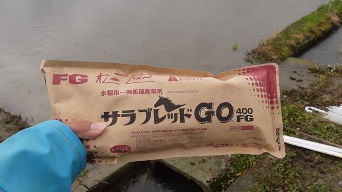 普通にミルキークイーンの代掻き再開・小雨の中、除草剤散布